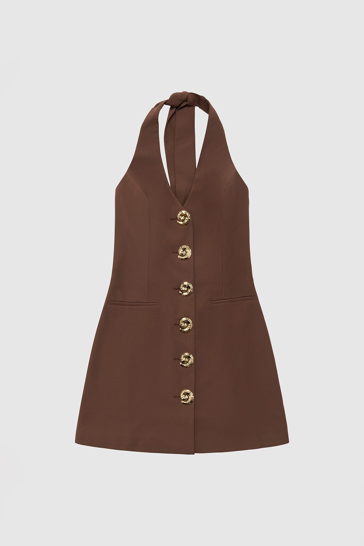 Das Irida Vest Dress ist das perfekte Minikleid für Tag und Nacht. Ein Neckholder-Westenkleid mit maßgefertigten goldenen Wirbelknöpfen verleiht ihm einen Hauch Wolf Gang-Flair. Kombinieren Sie das Irida Vest Dress mit der passenden Irida Bootcut-Hose für einen perfekten Gesamtlook.